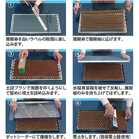 ---セット内容--- 1.展開串1組 2.土詰ブラシ1本 3.ポットシーダー1台 4.展開板1台(CP300A(大)ネギ、ホウレンソウ用) ---使用方法--- 1.展開串を白いラベルの隙間にさし込みます 2.展開串で展開板に広げます 3.土詰ブラシで周囲を叩くようにして堅めに培土を詰め込みます。